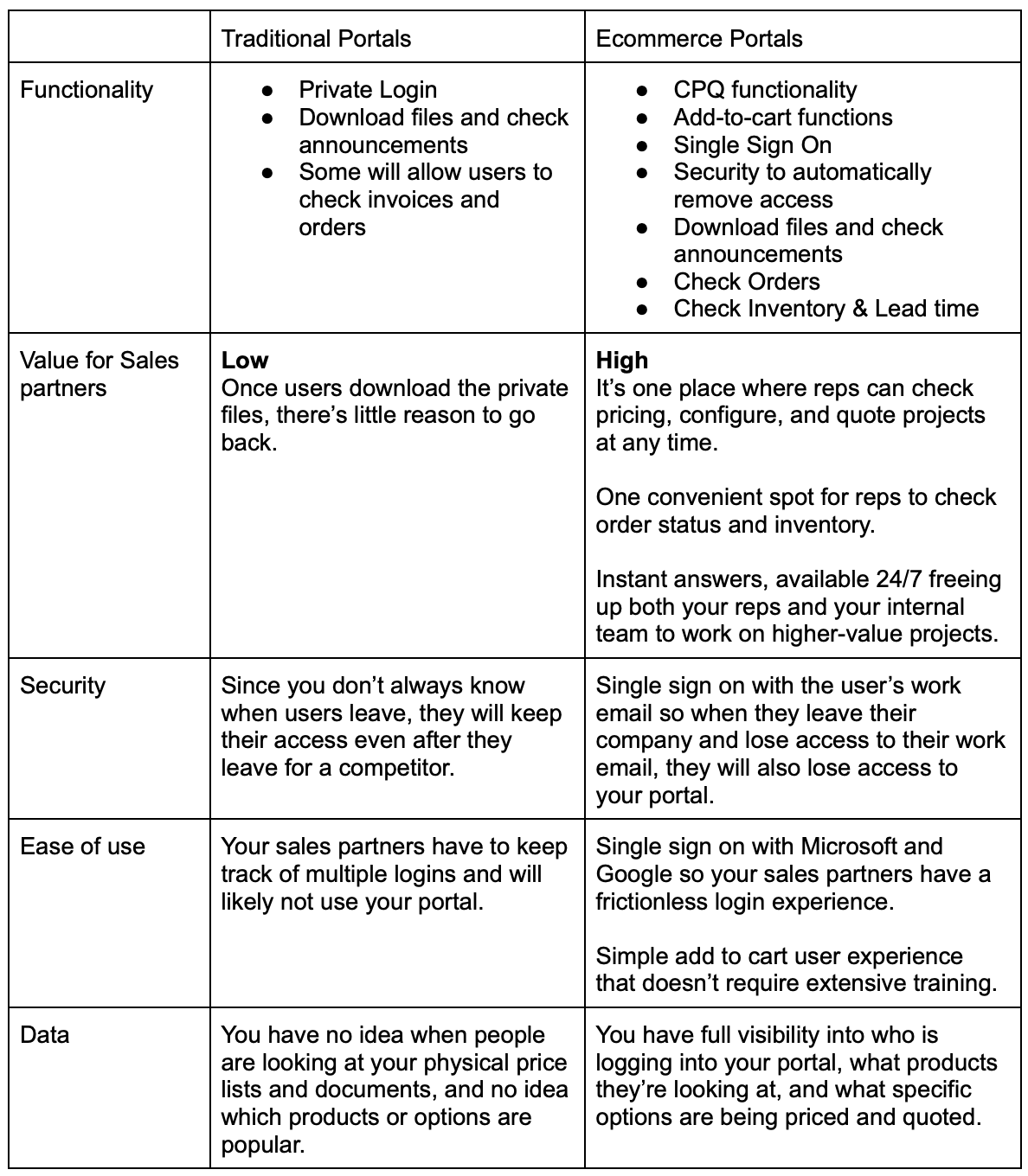 Relying on full price list files is risky, as you lose control over where they go. Departing sales partners can easily take the entire price file and login credentials. Modern e-commerce portals use 2FA and SSO to automatically revoke access when a user leaves their company.